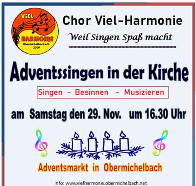 Der Chor Viel-Harmonie lädt euch herzlich ein, zum Adventssingen im Rahmen des Obermichelbacher Adventsmarkts am Samstag, den 29.11. um 16:30 Uhr in der Heilig-Geist-Kirche Obermichelbach.